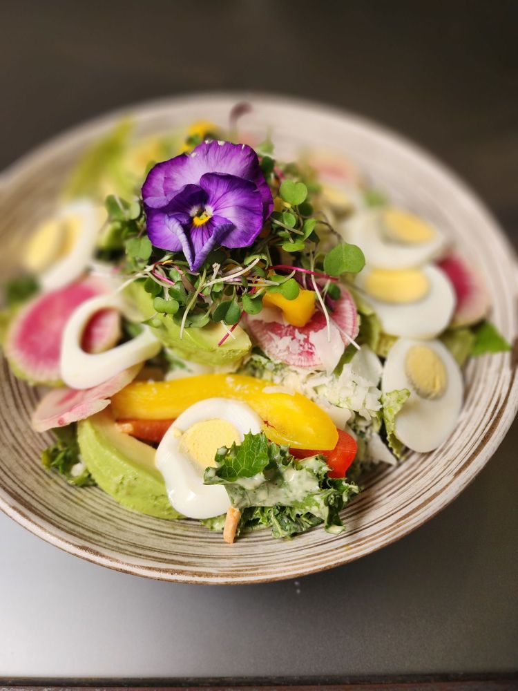 Organic greens / napa & purple cabbage / organic seasonal garden vegetables / hard-boiled egg / avocado / parmesano reggiano / green goddess dressing